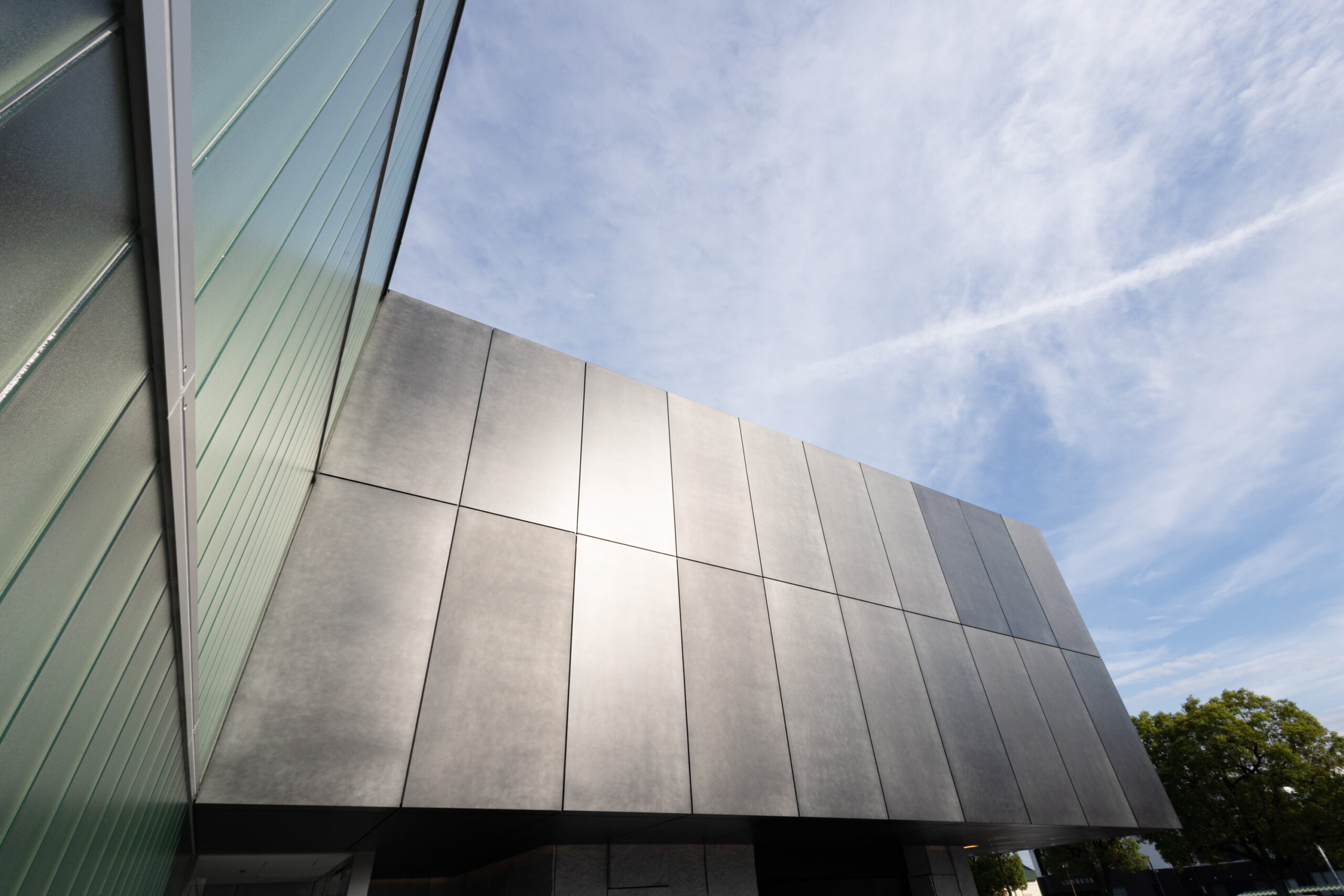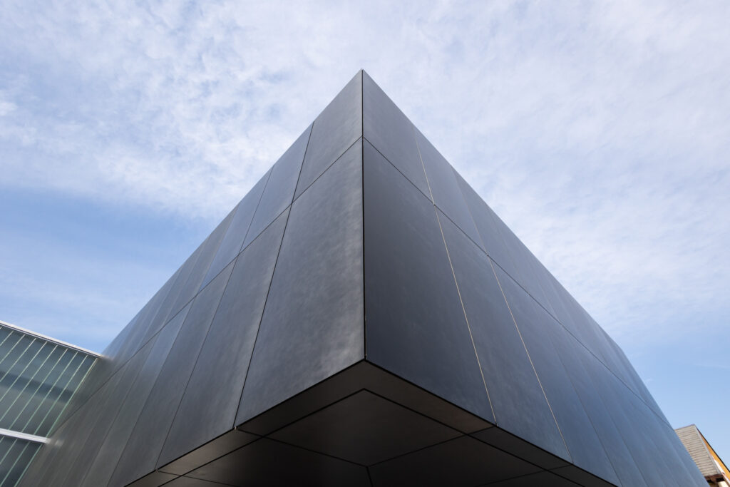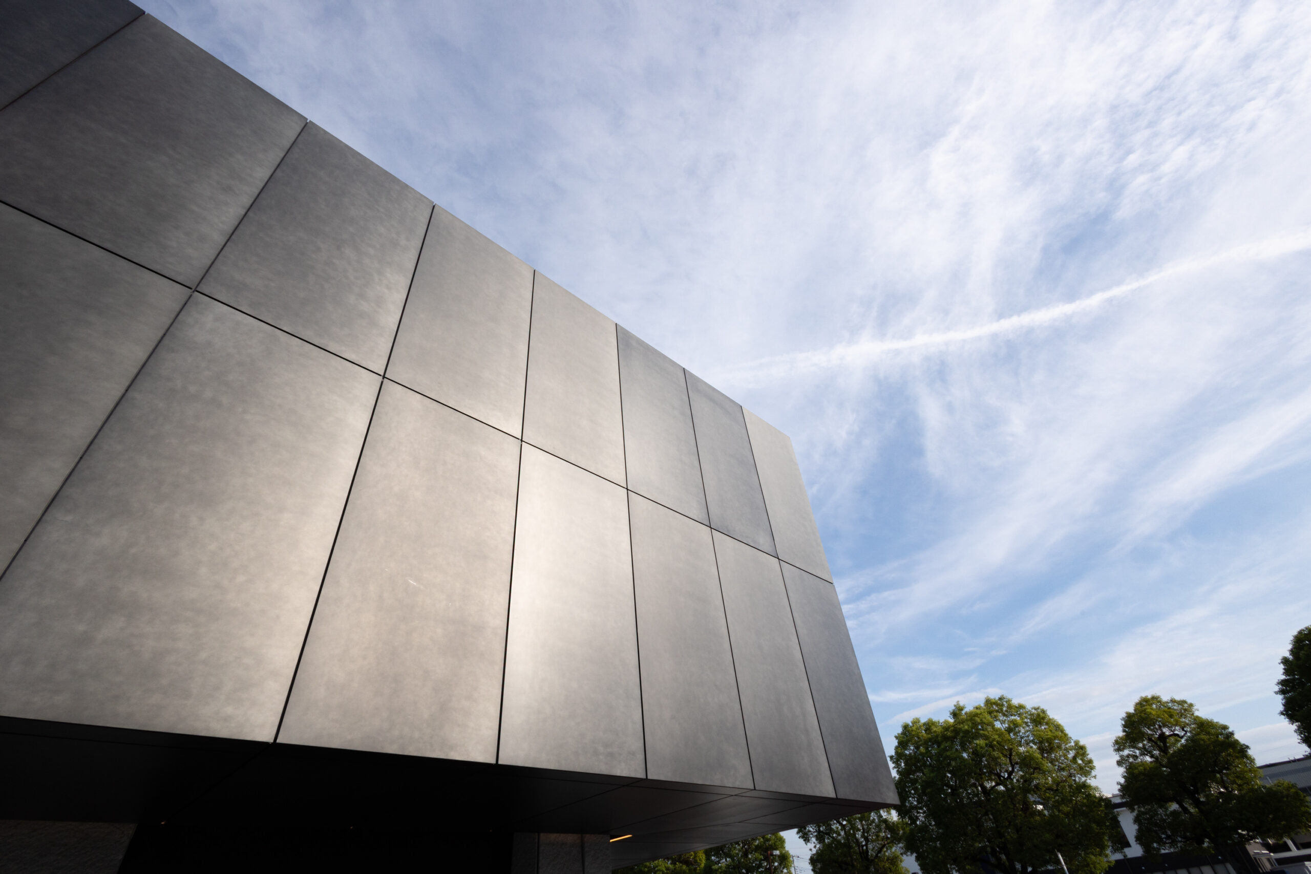 設計者様が仕上に求めたのは、「自然なムラ感があること」と「他にない仕上であること」の二点でした。加えて、余計なものが見えないすっきりとした意匠と、確かな水仕舞を兼ね備えた納まりの両立も、この案件における重要なテーマでした。その要件に応えるため採用されたのが、「CRAFT N. Light」(高耐食メッキ鋼板・t2.3mm)のカットパネルです。パネルエッジを効かせた金属パネルらしいシャープな表情と、職人の手仕事による自然なムラ感が共存するこの仕上は、設計者様が重視したポイントを体現するものでした。