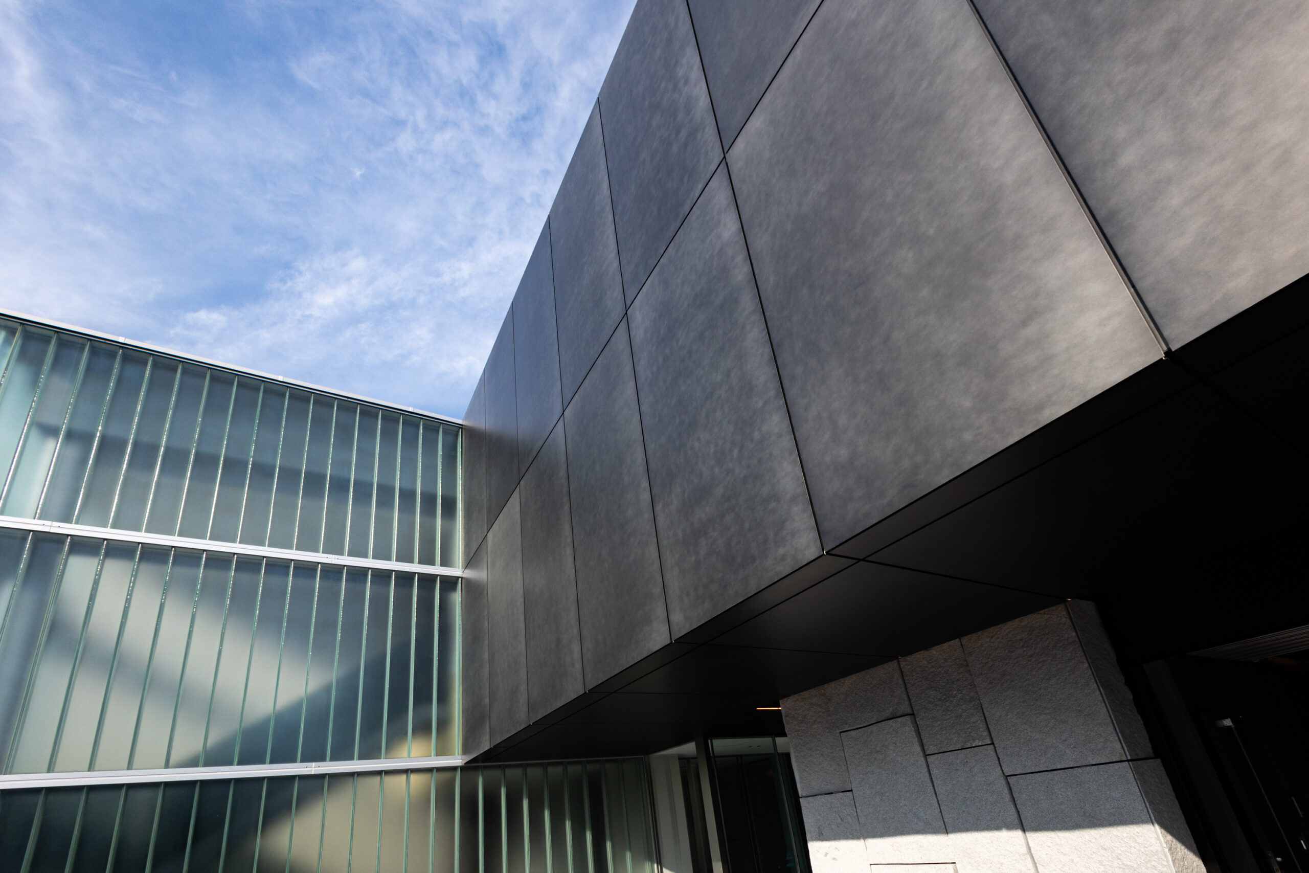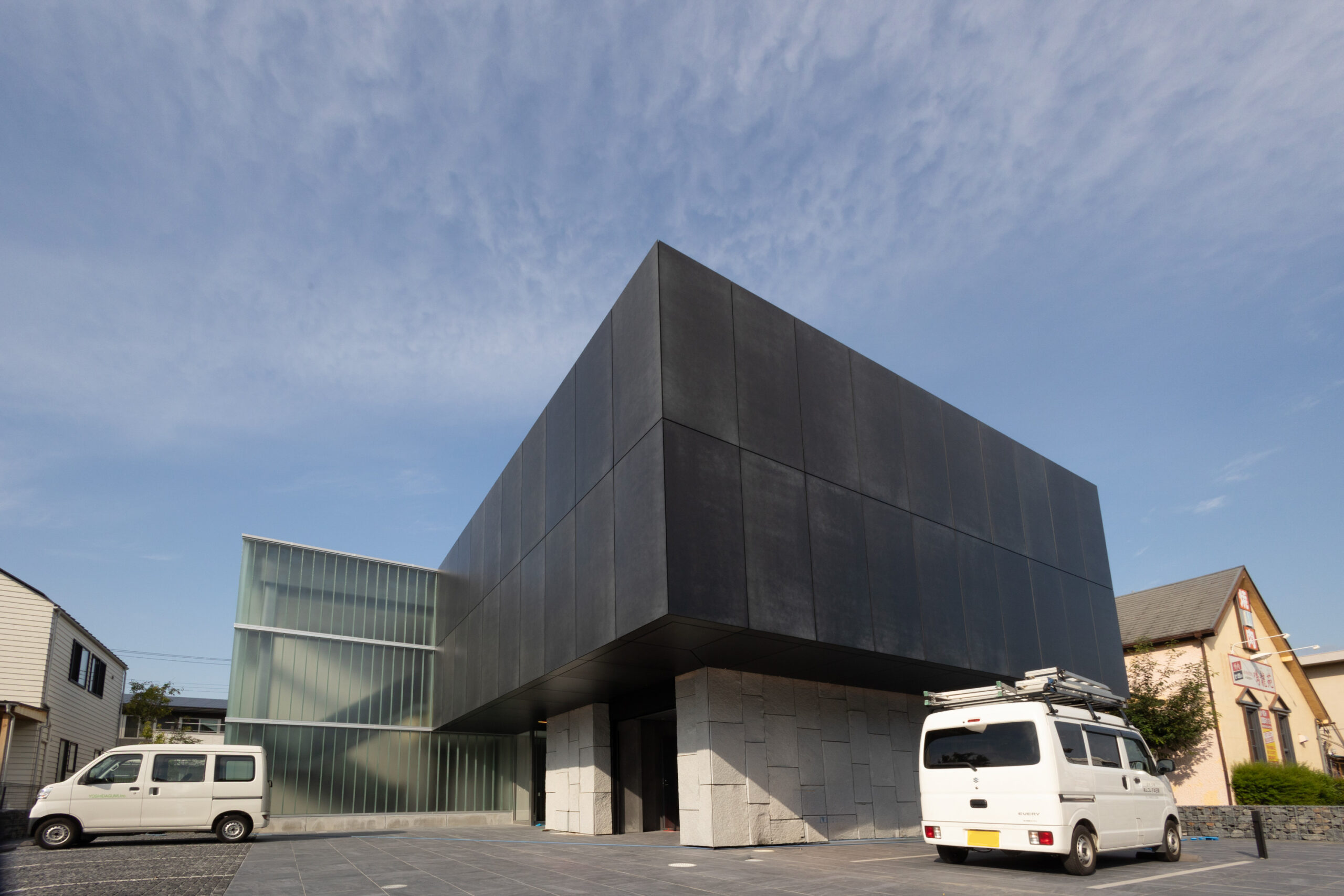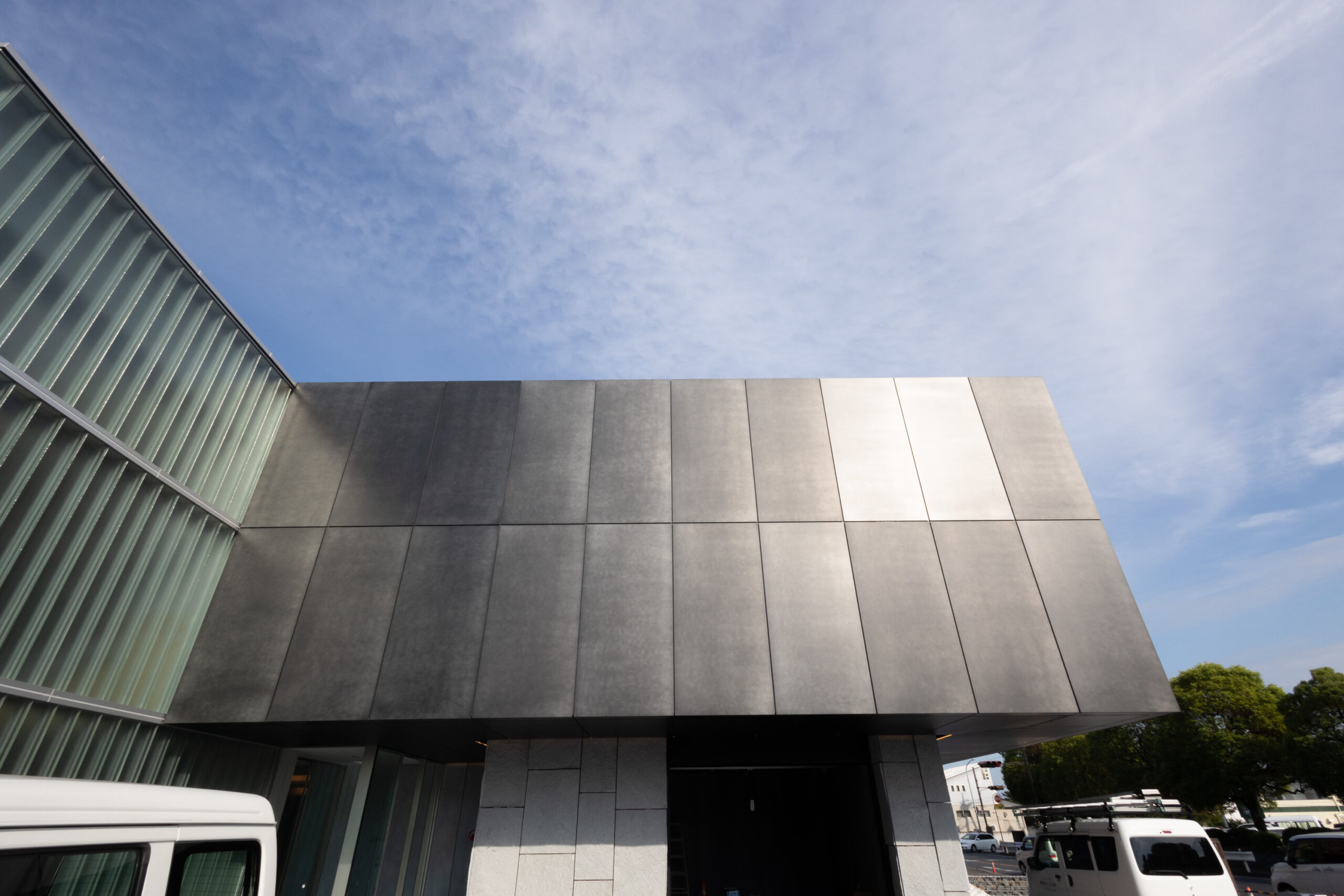 竣工した外観を前にして感じるのは、考え抜かれた納まりの中で、フロントの金属パネルをはじめ、こだわり抜かれた建材が互いの存在感を引き立て合っているということです。縦長のガラスブロック、白色系の割石とともに、CRAFT N. Lightのカットパネルが広い青空の下で調和しながらもメリハリのある外観を形成している姿をみて、設計事務所様のデザイン思想が体現しきることができたと思います。