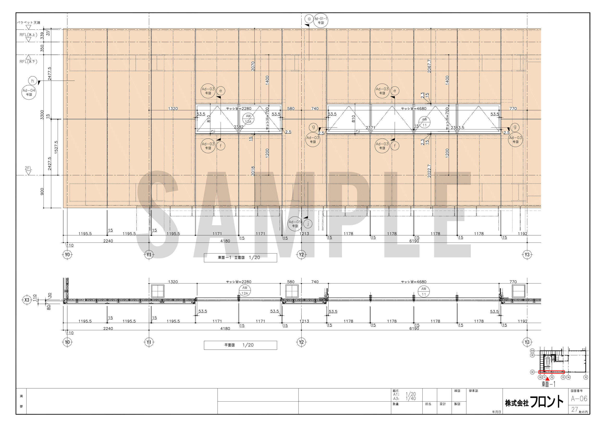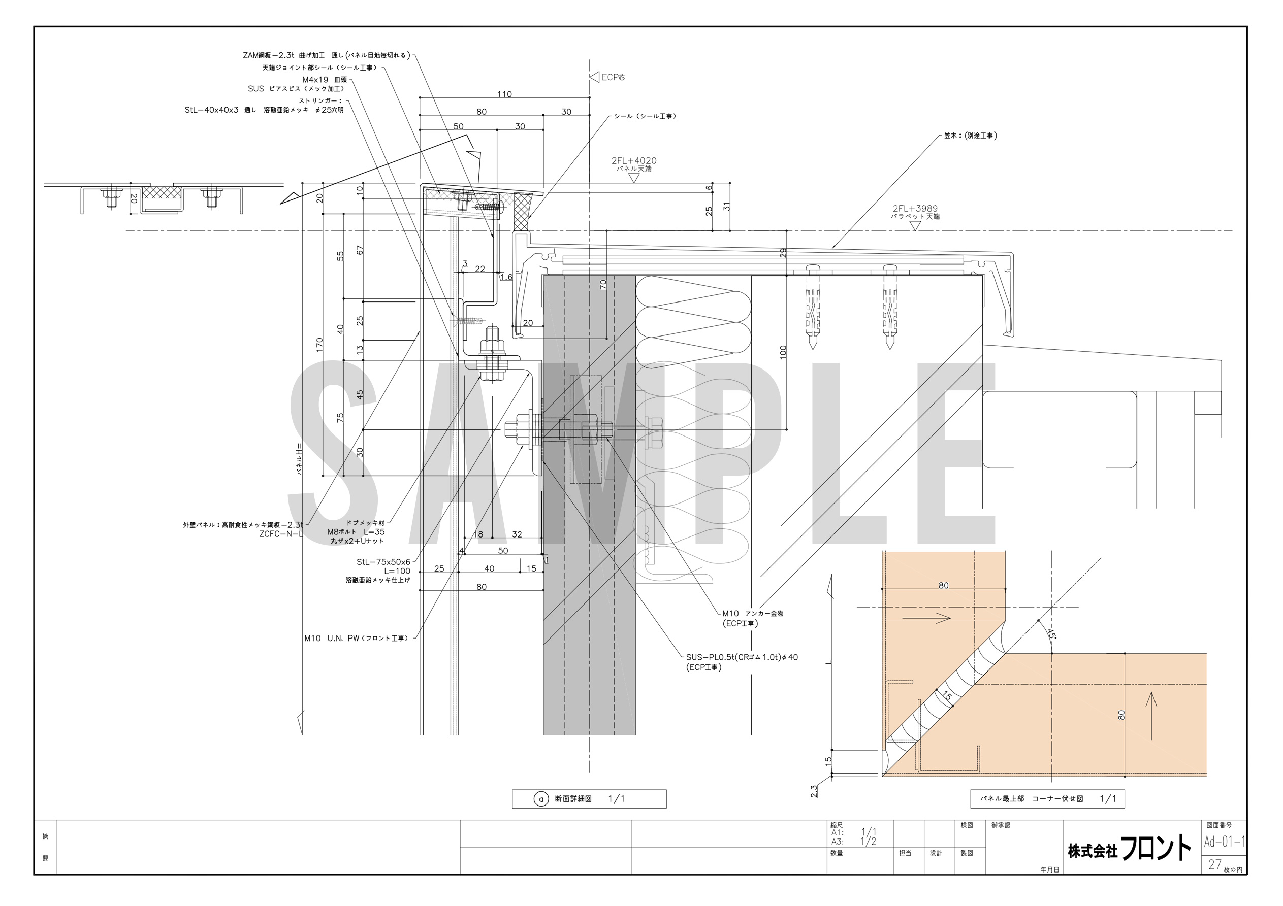 実際の施工段階では、原設計の矩計図が潜在的に持っていた雨水対策の課題とも正面から向き合いました。当初のディテールではカットパネルの裏側に雨水が流入してしまう恐れがあったため、壁パネルの天端を曲げ加工とした上でアルミ笠木に絡めてシールすることで流入を抑制。さらに、流入した雨水を排水するため、通常とは逆の施工順を採用。大判の軒天パネルにボーダー的なパネルを割り付ける形とすることで、雨水を外部へ排出しながら壁パネル先行の美しい納まりを実現しました。