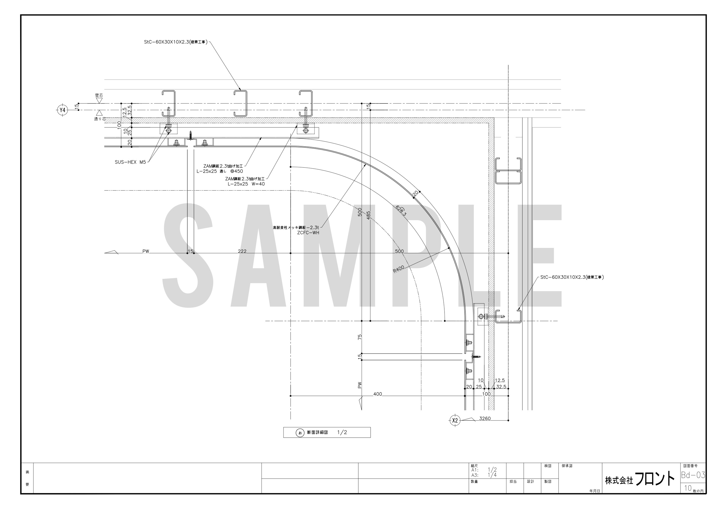 基本設計段階でパースを共有していただき、笠木・下笠木・出隅・入隅・開口部廻りといった各部ディテールについて、設計事務所様と膝を突き合わせた打ち合わせを重ねました。特に笠木部分のデザインディテールと下端笠木の水仕舞については、計画の初期段階からスケッチを取り交わしながら意見をすり合わせ、意匠性と機能性が両立する答えを丁寧に積み上げていきました。コスト感についても設計事務所様と随時共有しながら進めたことで、事前に把握いただいた予算と乖離なく設計事務所様のデザイン思想を体現することができました。