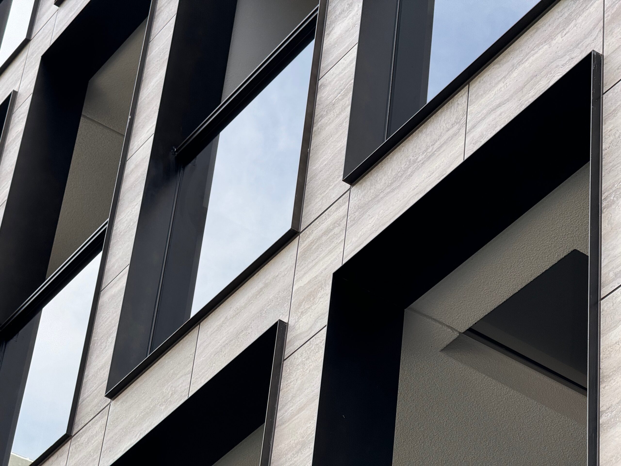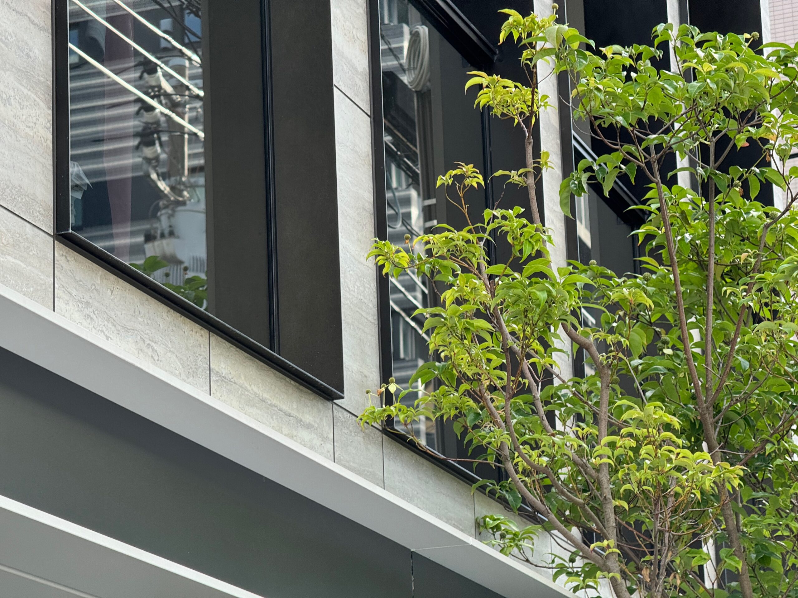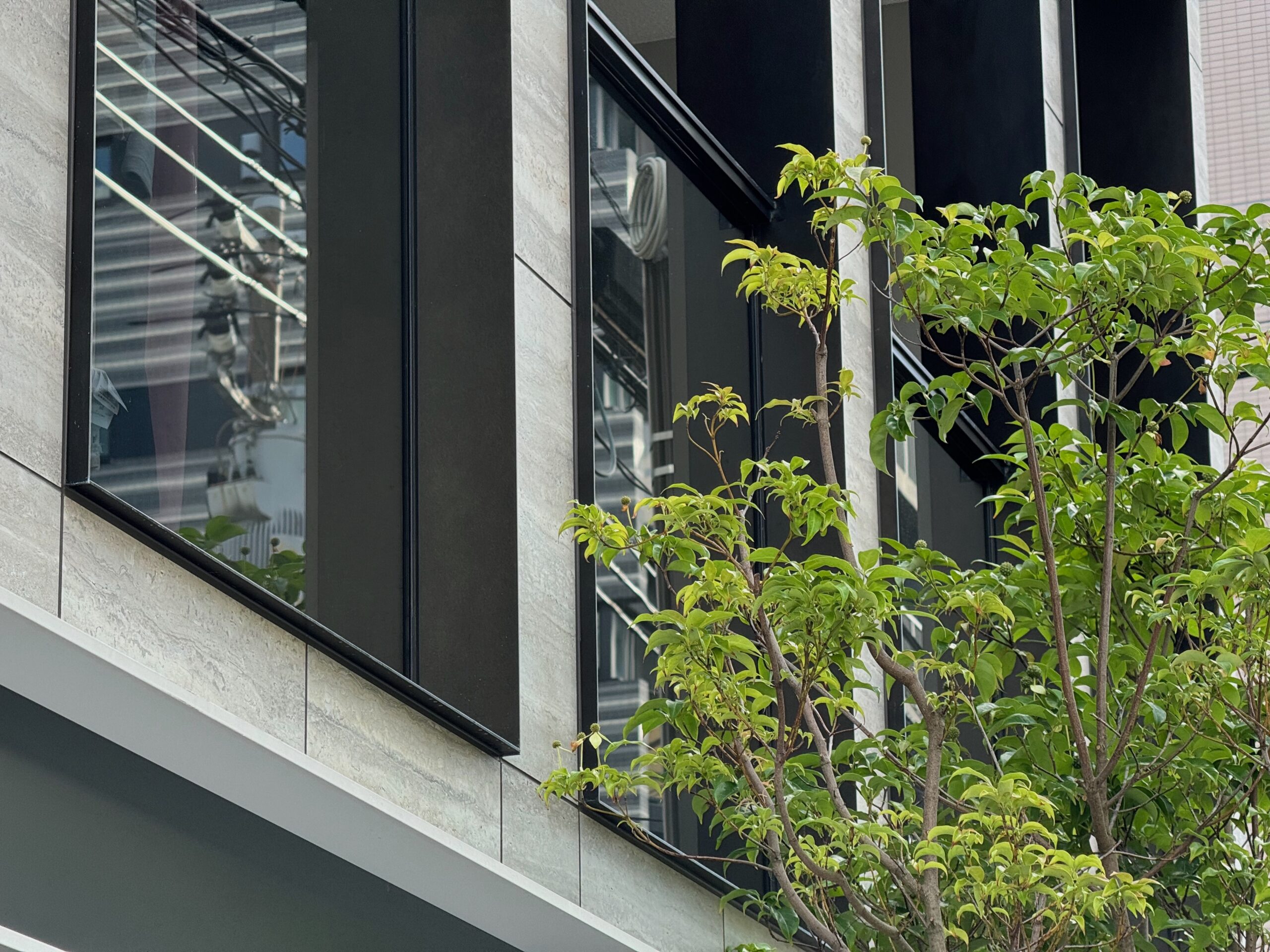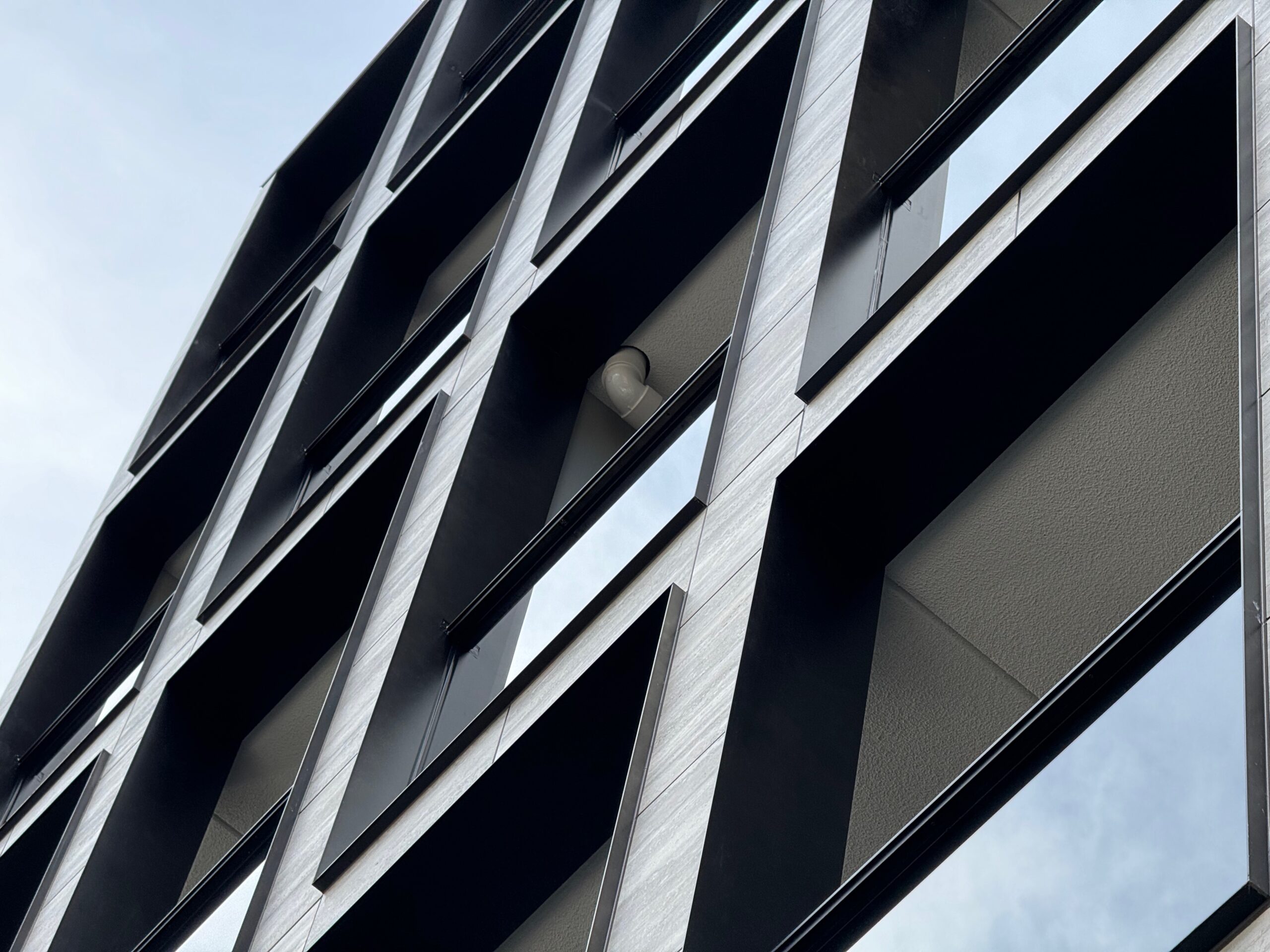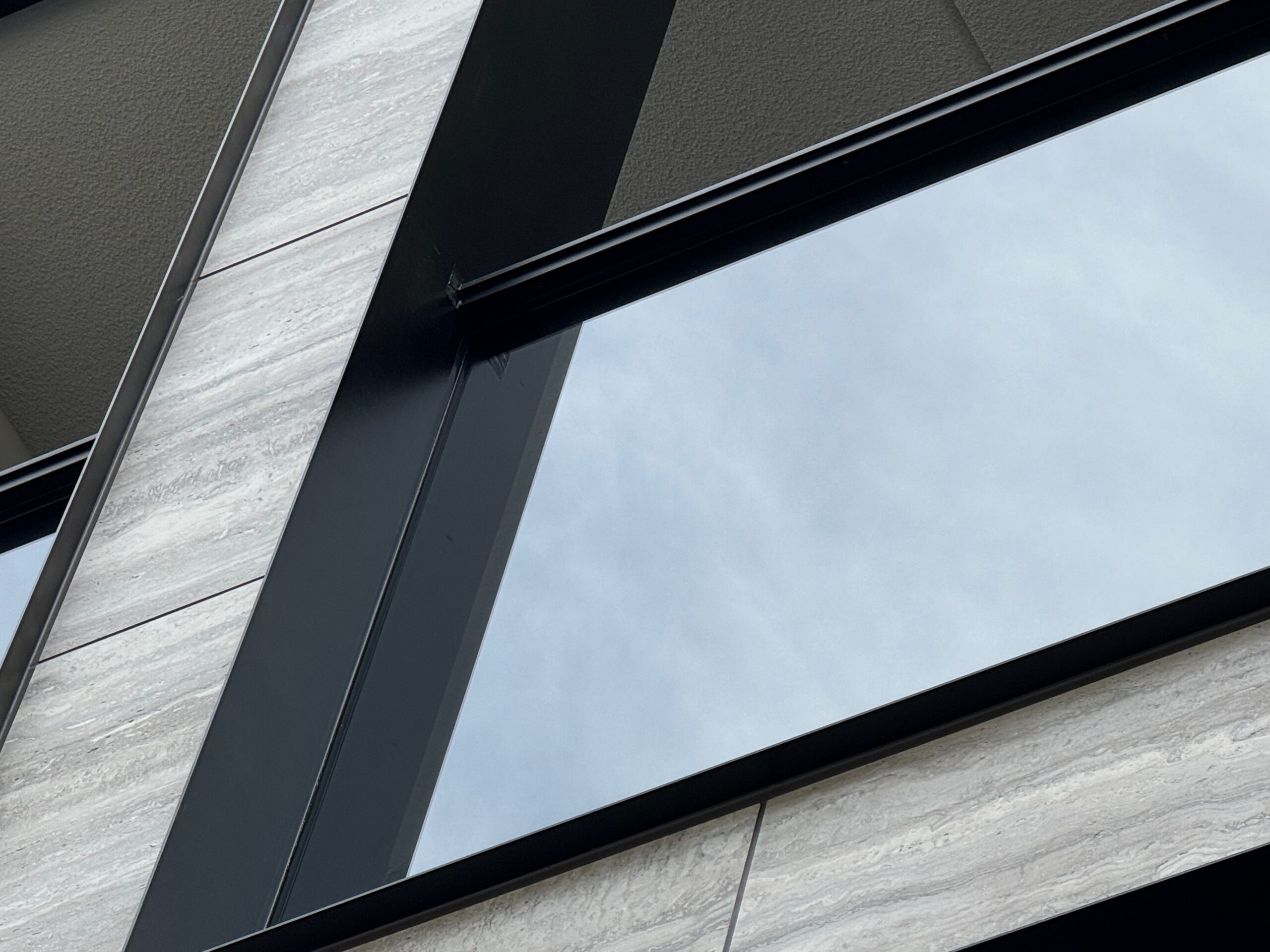 神楽坂駅からほど近くに2024年6月に竣工した「ピアース神楽坂センティア」は、モダンなファサードのデザインが印象的です。特にグリッド状に並んだ開口部を縁取るガラス手摺は、この建物のデザインにすっきりとした解放感を生み出しています。この開放感あふれるシャープさを生み出すために、フロントは様々な工夫を凝らしました。