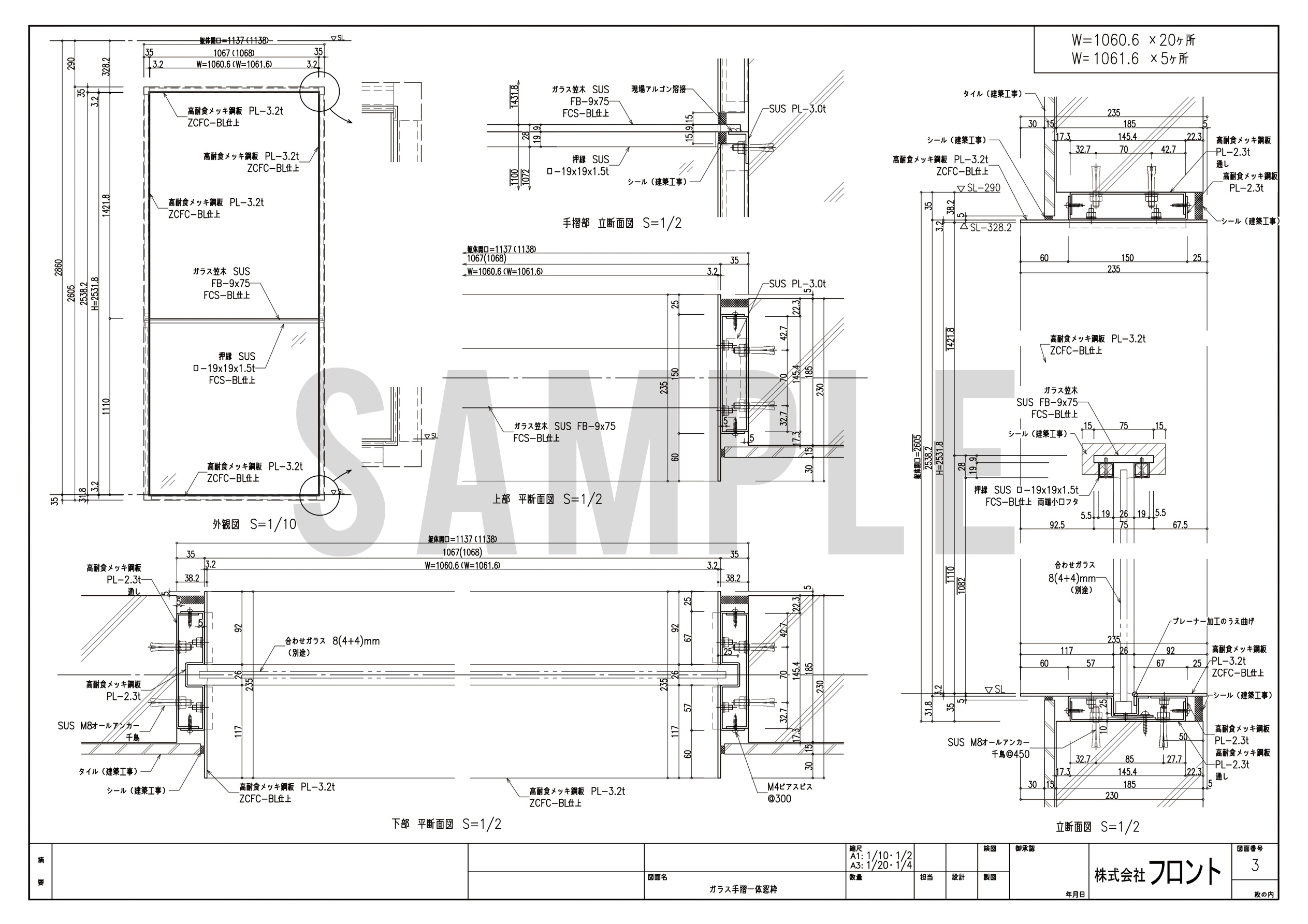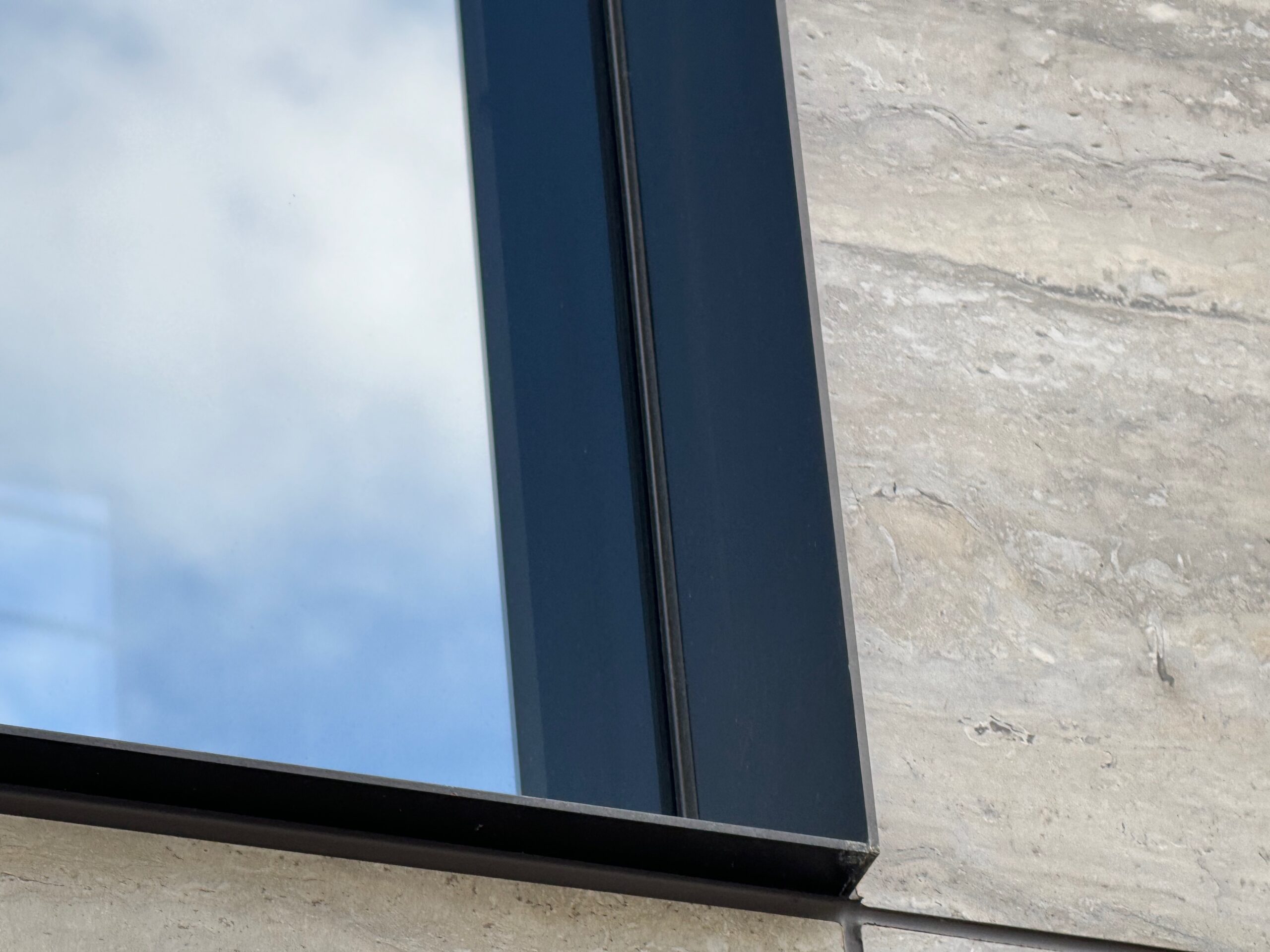 通常ガラス手摺では枠の中にガラスをはめ込むため、枠に太さが生まれてしまいます。しかし今回必要とされたものは出来る限りスリムなもの。そのため、枠にガラスを差し込み、ガラスを上からのみ取り外せるようなつくりにしました。その結果、ガラスと手摺に隙間が生まれず、ガラスと手摺が一体になったようなすっきりとしたつくりが実現できました。手摺のみ太く、枠はスリムでシャープに仕上がったことによって、その広々とした開口部をより強調させます。また、壁面からわずかに外に出した四方枠から感じられる立体感はぜひ注目していただきたいポイントの1つです。