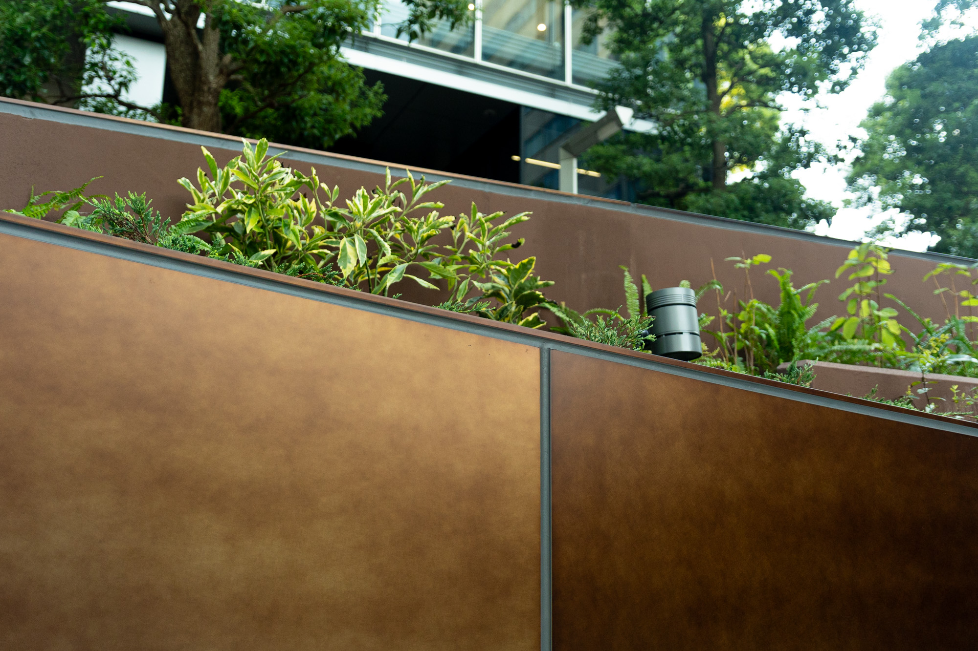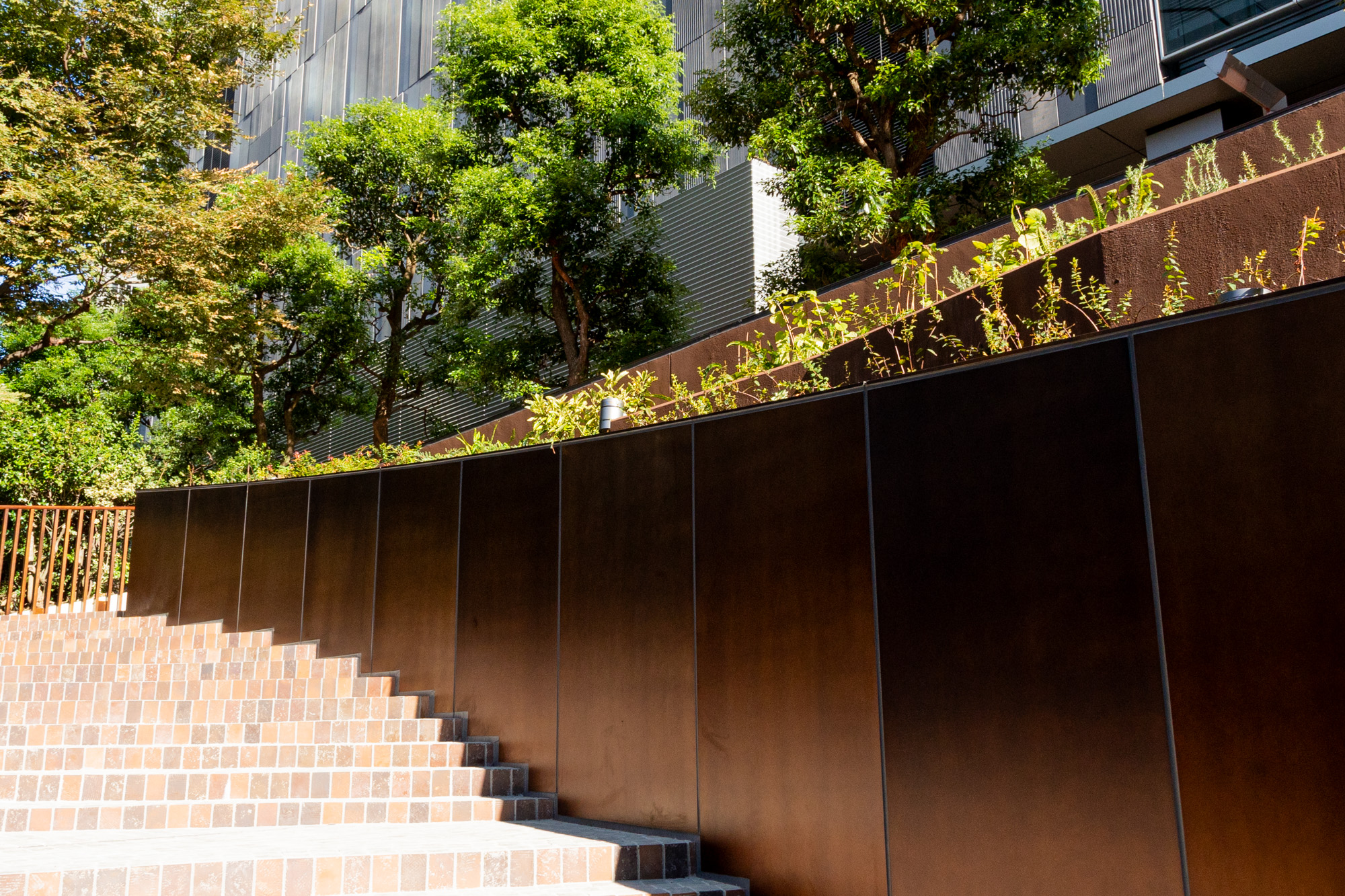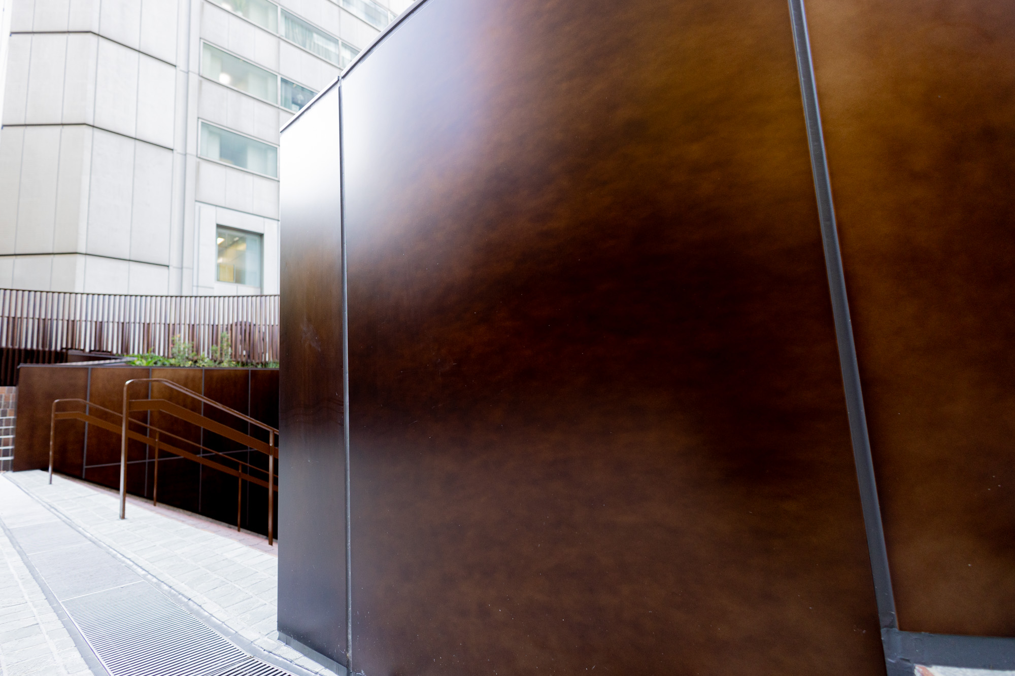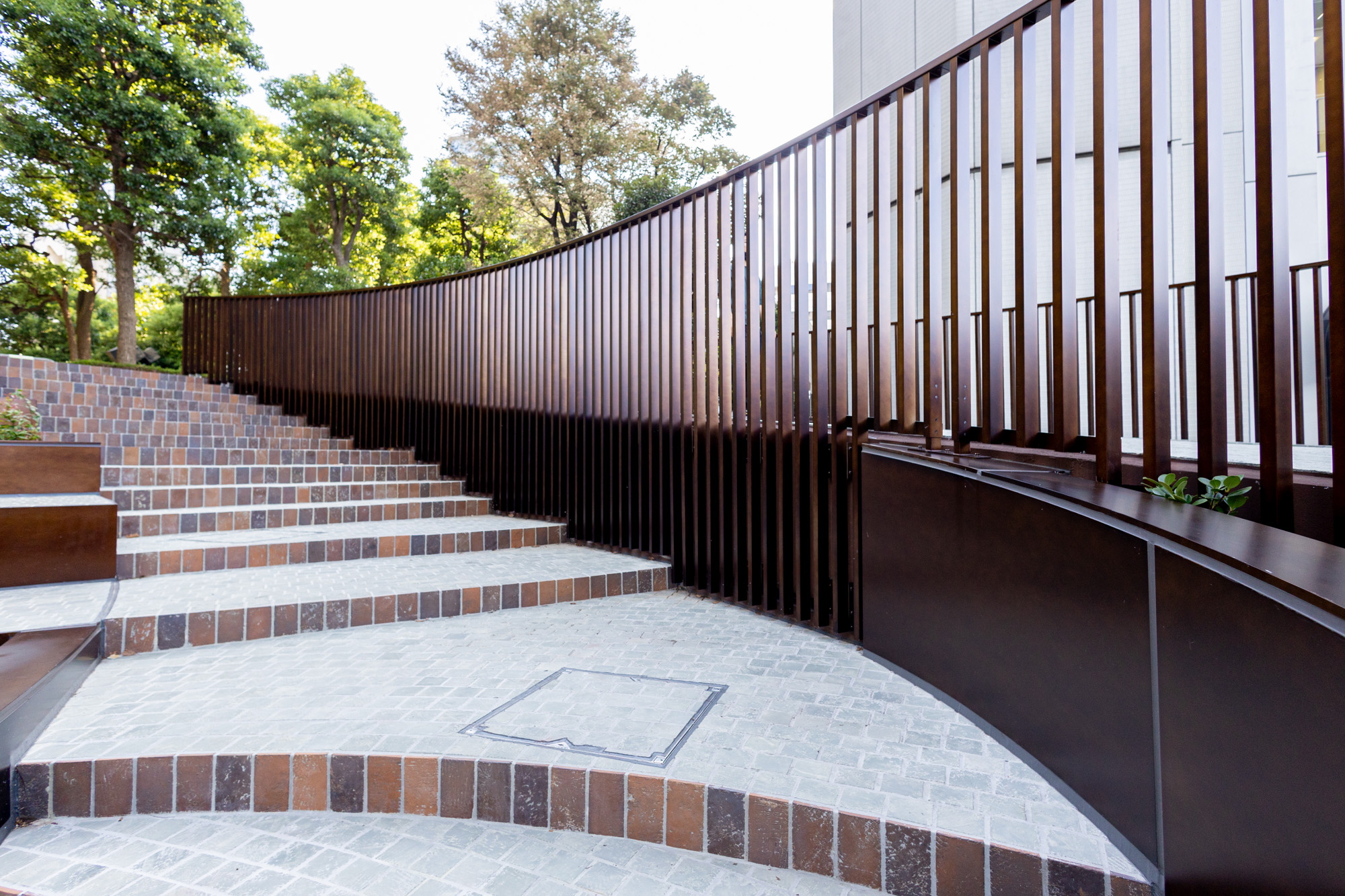 植栽、ベンチ、B1階へ続く階段の周りを覆うパネルは手仕事だからこその斑感があり、それぞれに表情が異なります。一枚の中でも濃淡があり、それらが何枚も並ぶことで、広い面積を金属で覆いながらも圧迫感の無い景観を作り出しました。