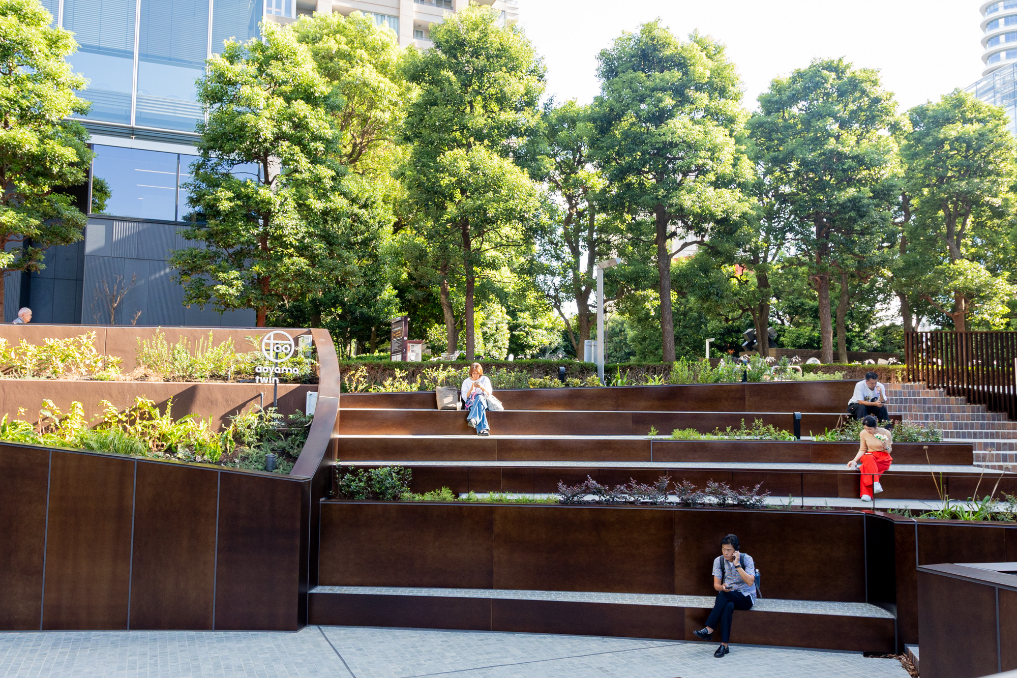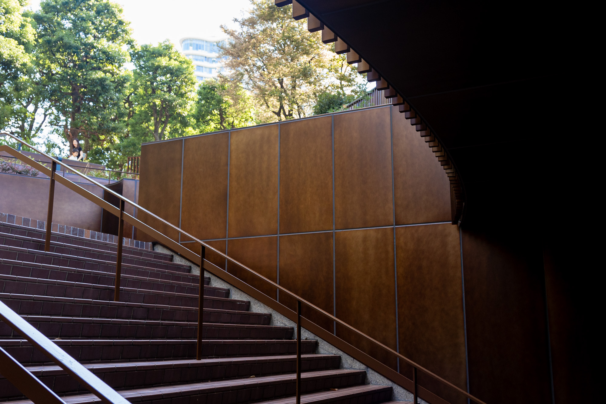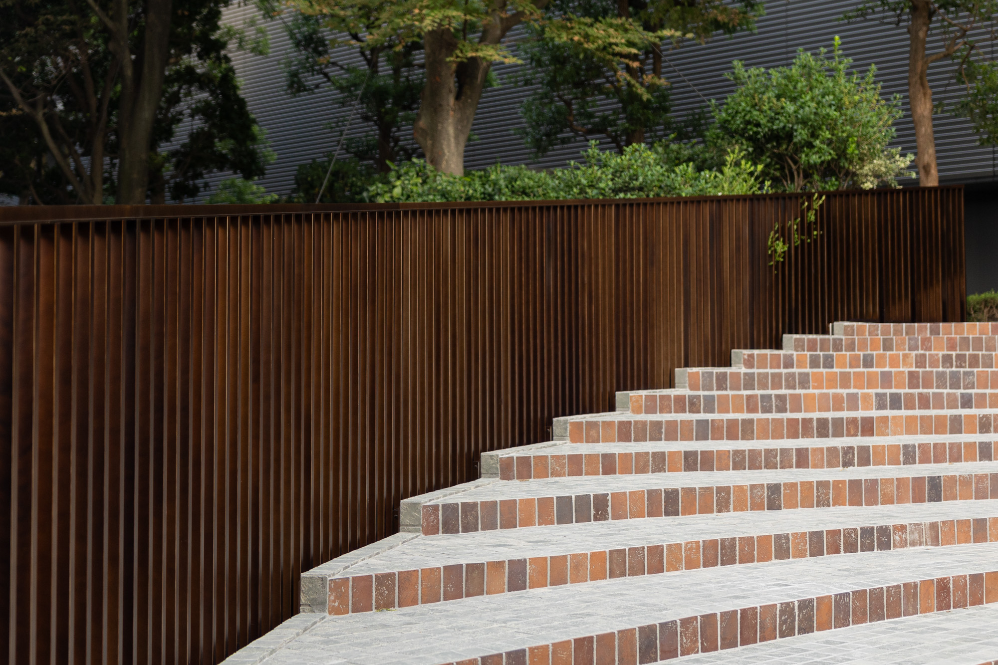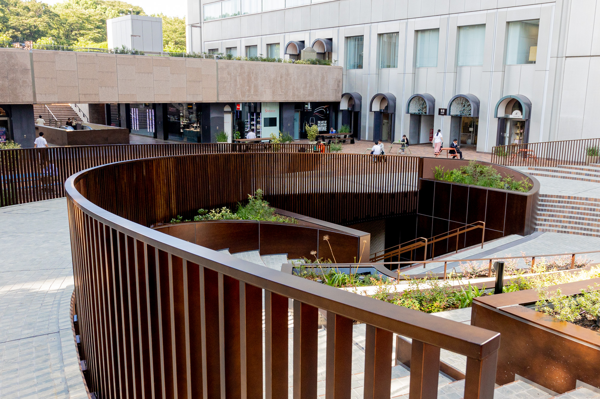植栽、ベンチ、B1階へ続く階段の周りを覆うパネルは手仕事だからこその斑感があり、それぞれに表情が異なります。一枚の中でも濃淡があり、それらが何枚も並ぶことで、広い面積を金属で覆いながらも圧迫感の無い景観を作り出しました。