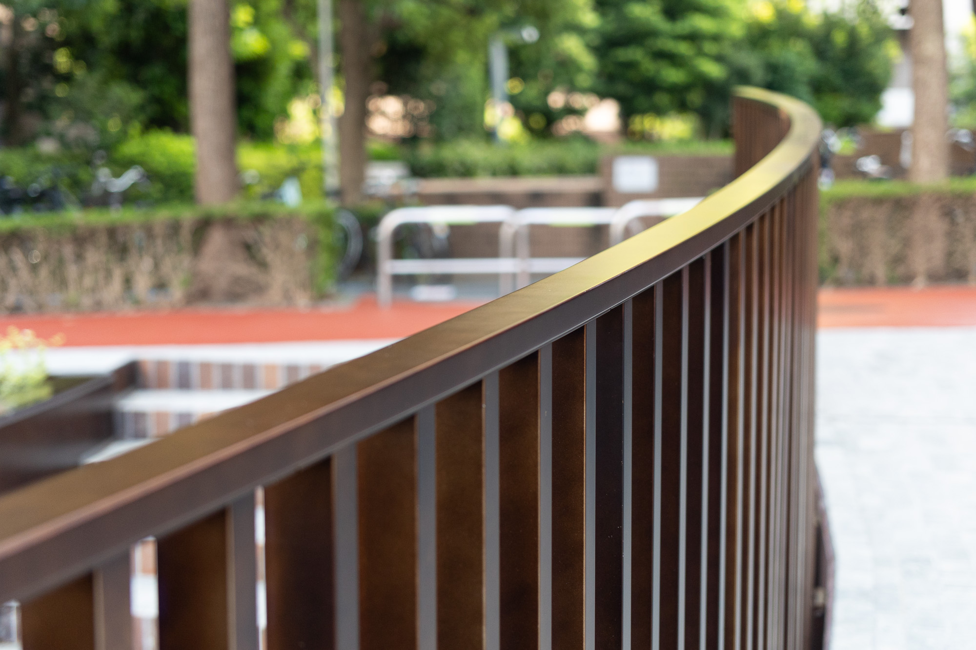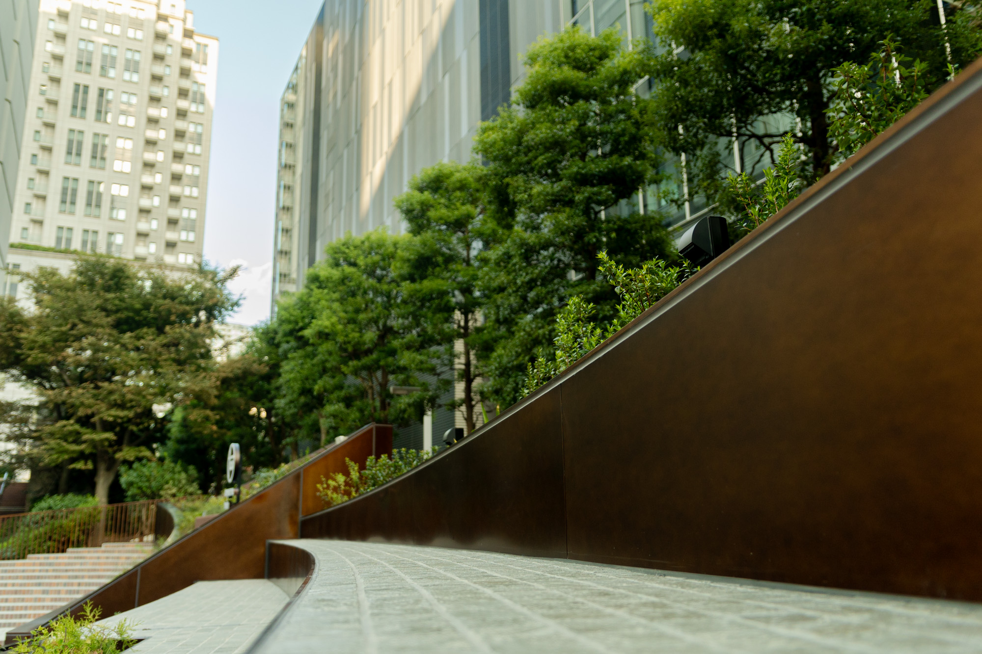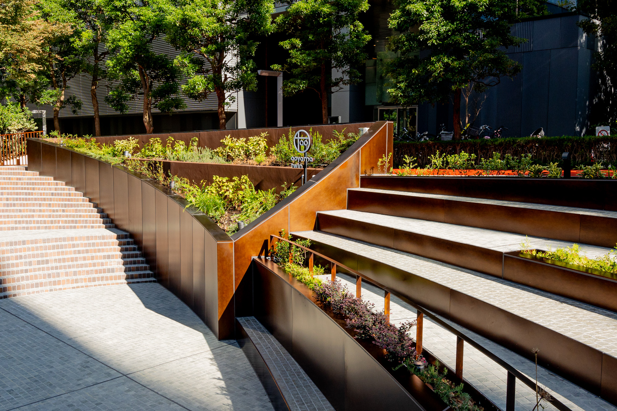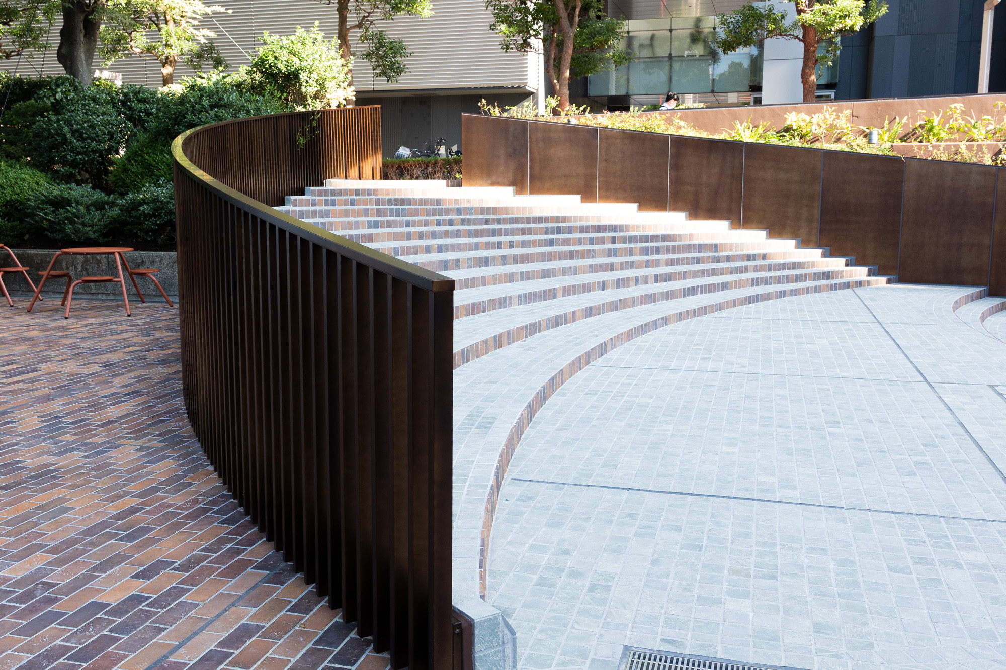 スロープ手摺、植栽の土留め、階段状のベンチと手摺は全てCRAFT STAINLESSの特注色。当初、ご担当者様のイメージでは本物の錆を出す耐候性鋼を使用する計画でした。しかし、生錆ゆえ錆が成熟していく間に流れ出てしまったり触れるものに付いて汚してしまったりといった懸念事項があるため、人が触れる手摺やベンチには適さない素材だという判断になりました。