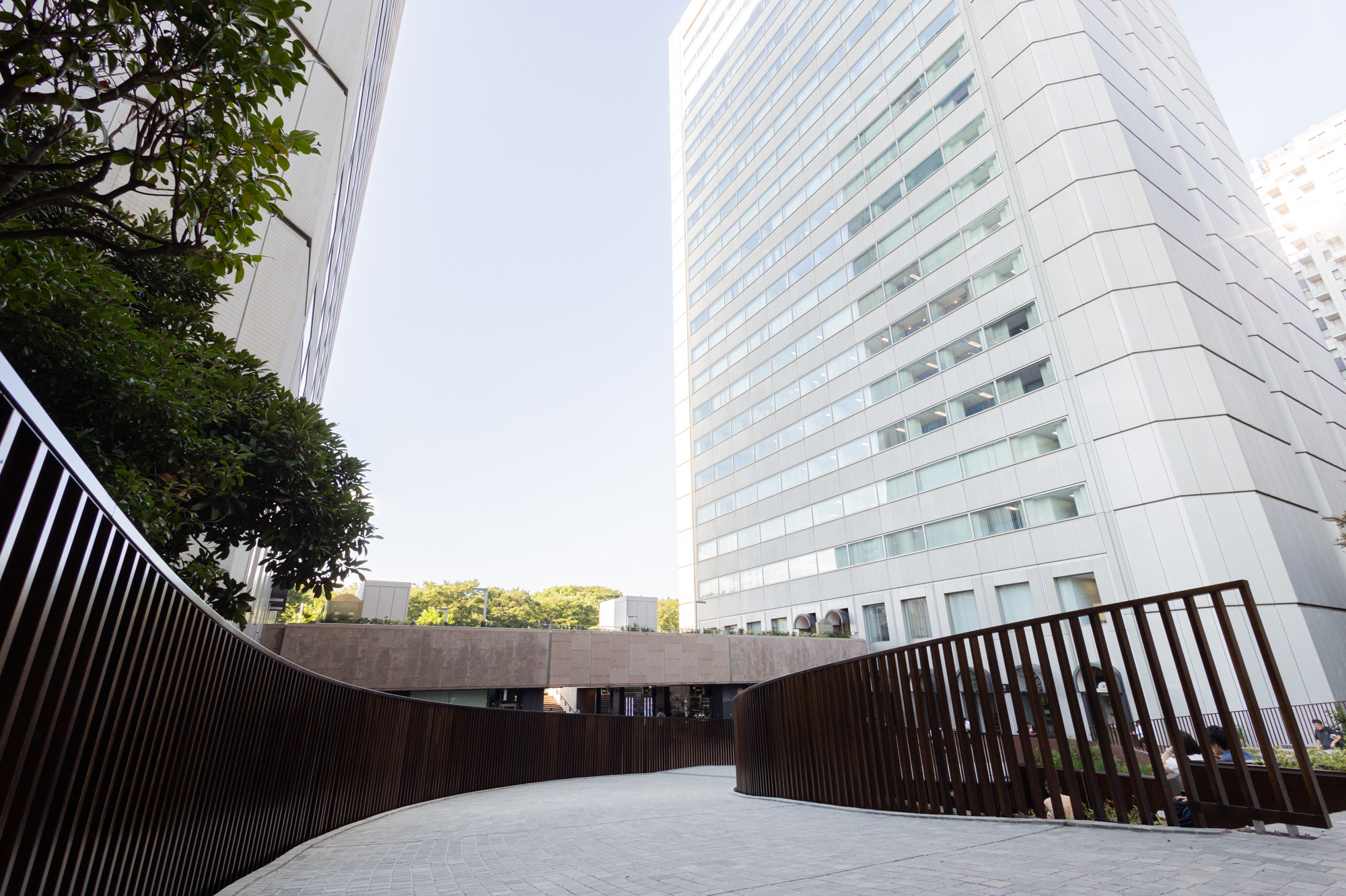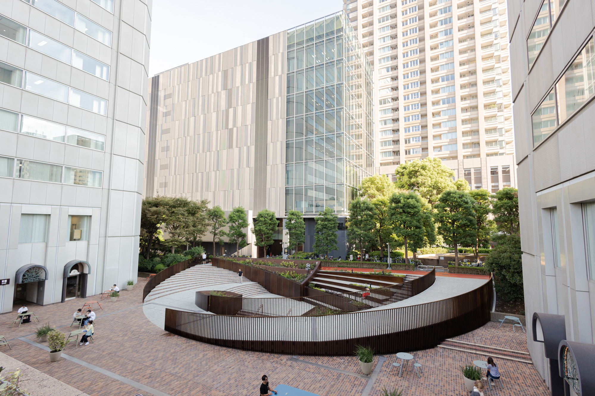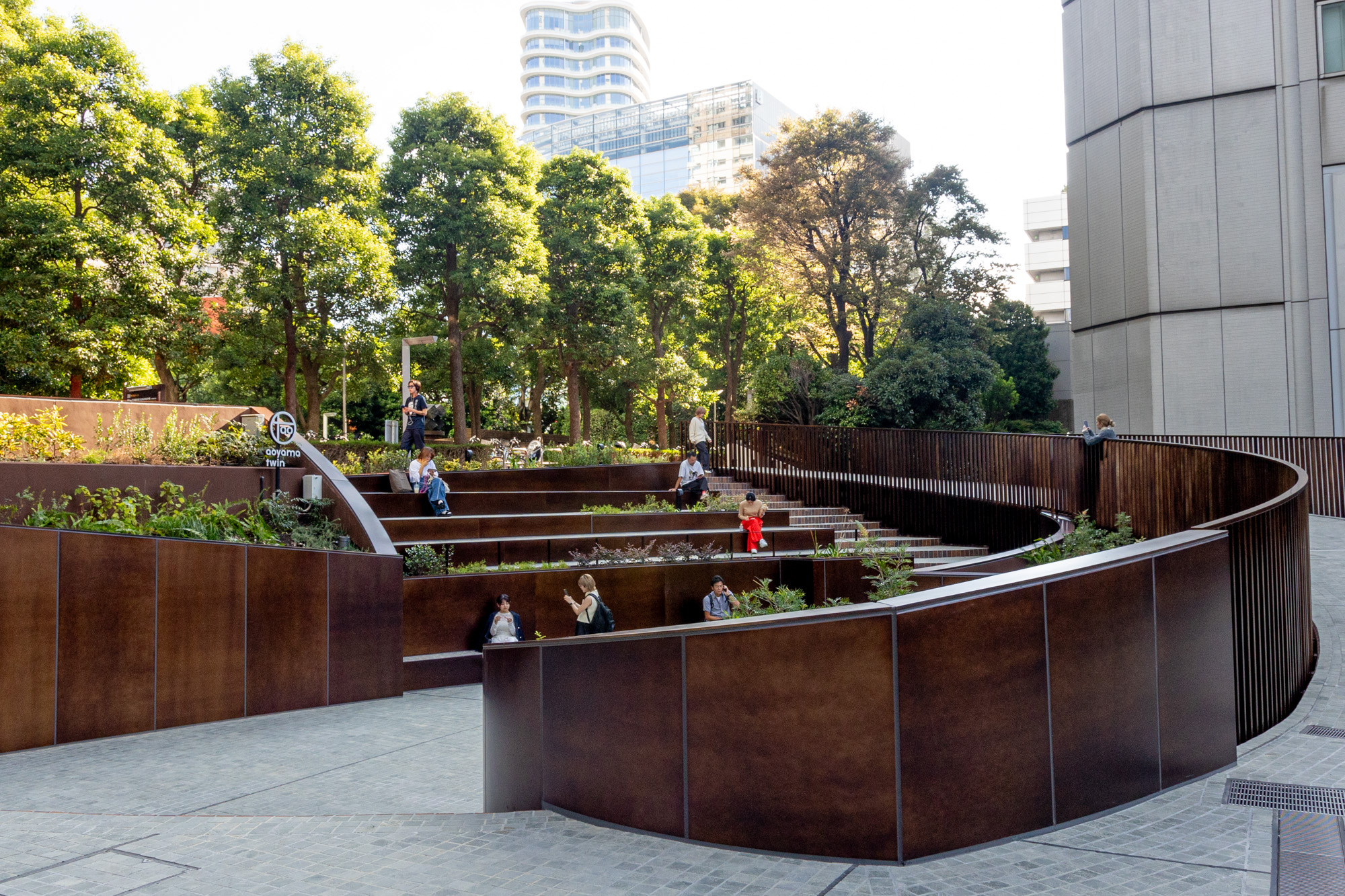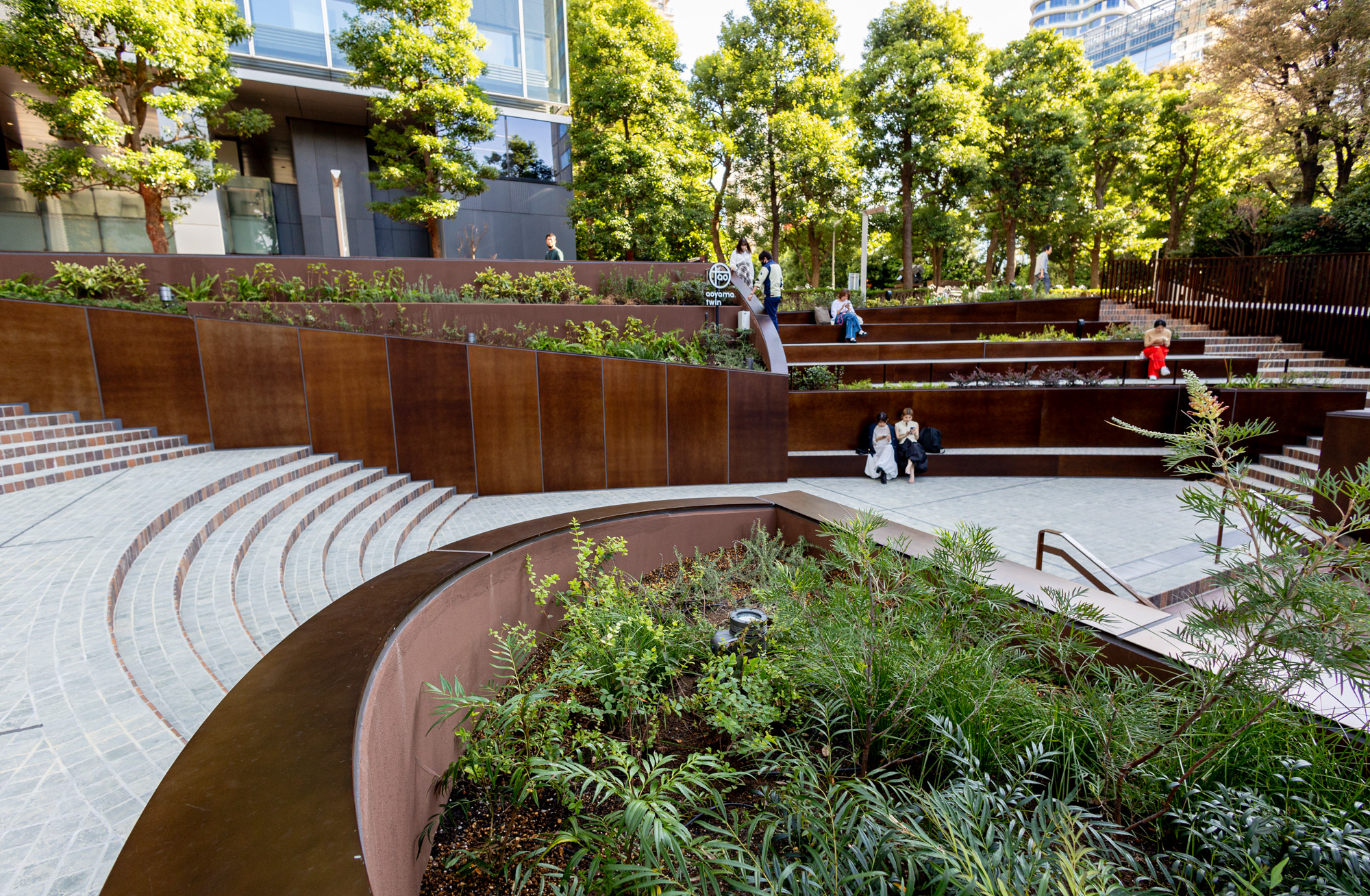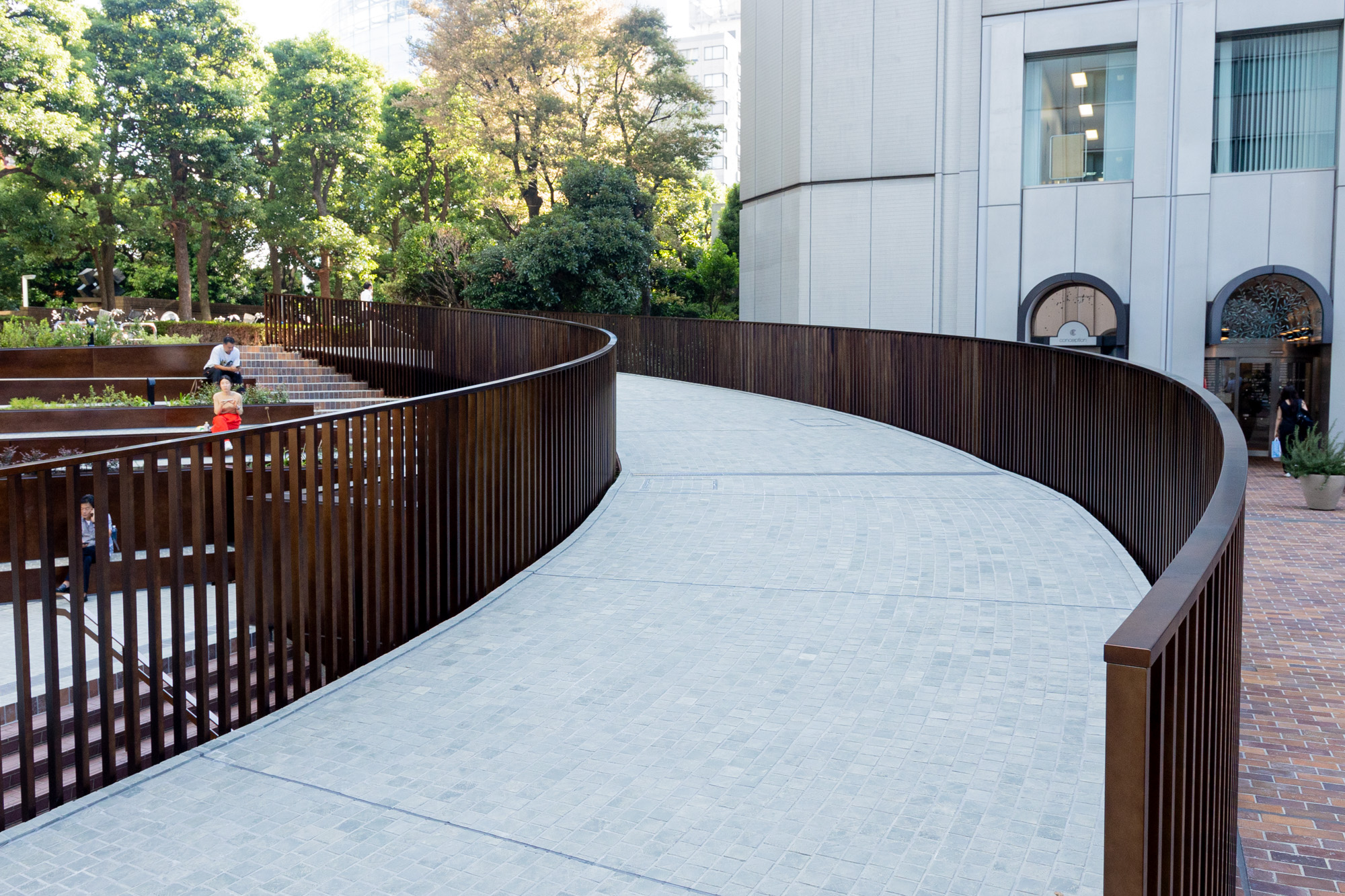 以前の中庭は欧州を思わせるシンメトリーな作りでしたが、リノベーション後は打って変わって大きく螺旋を描いたスロープと、それに合わせた階段やベンチ、植栽によりアシンメトリーながら大きなひとつの円を描くような景観に変わっています。