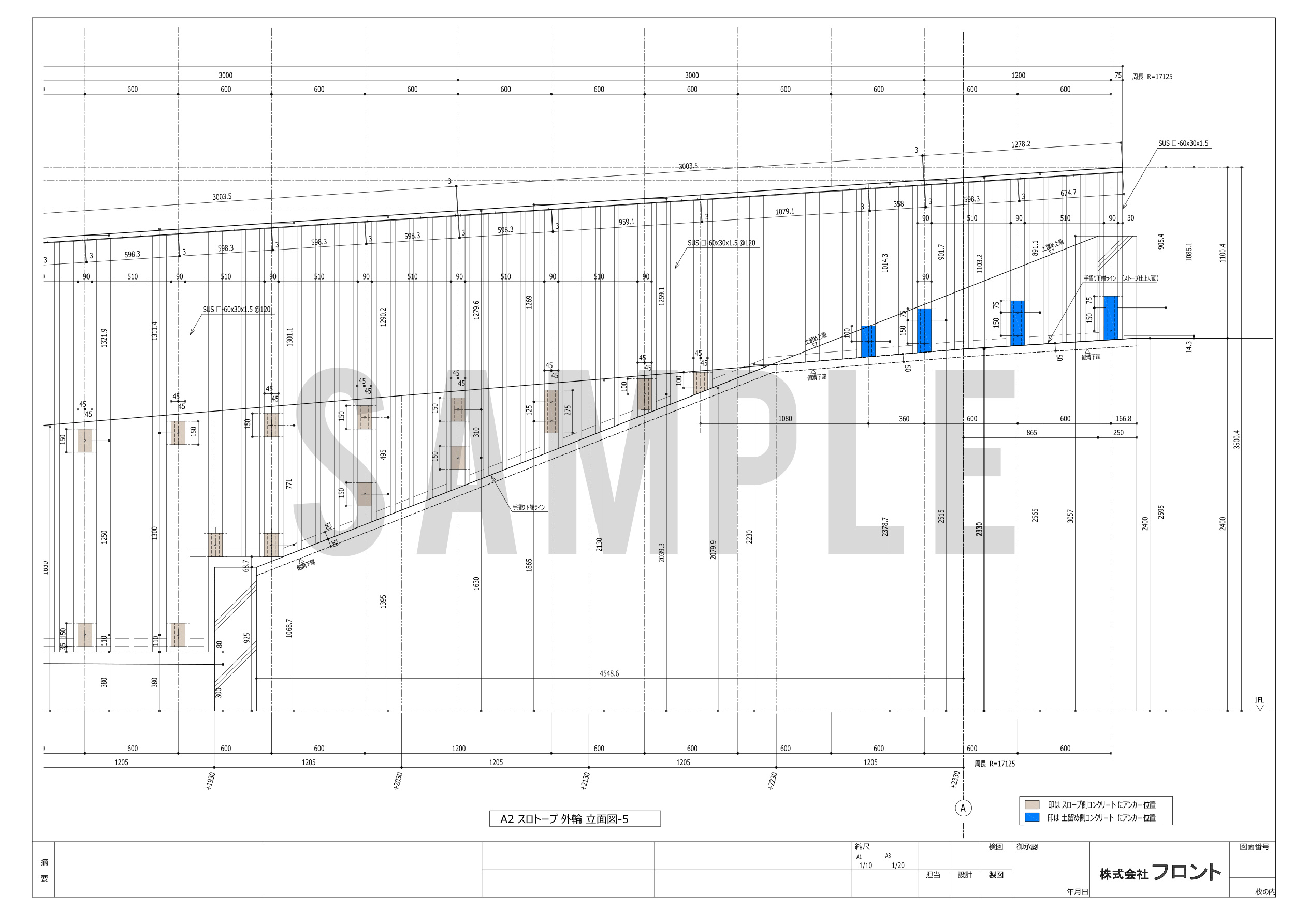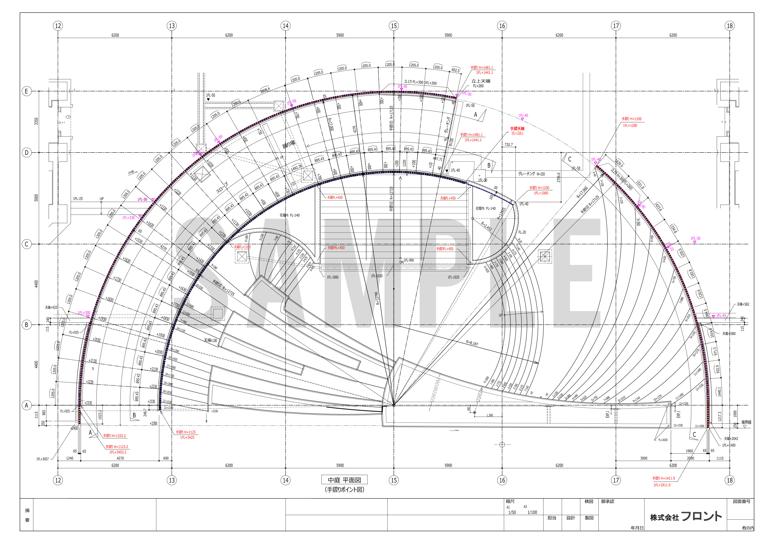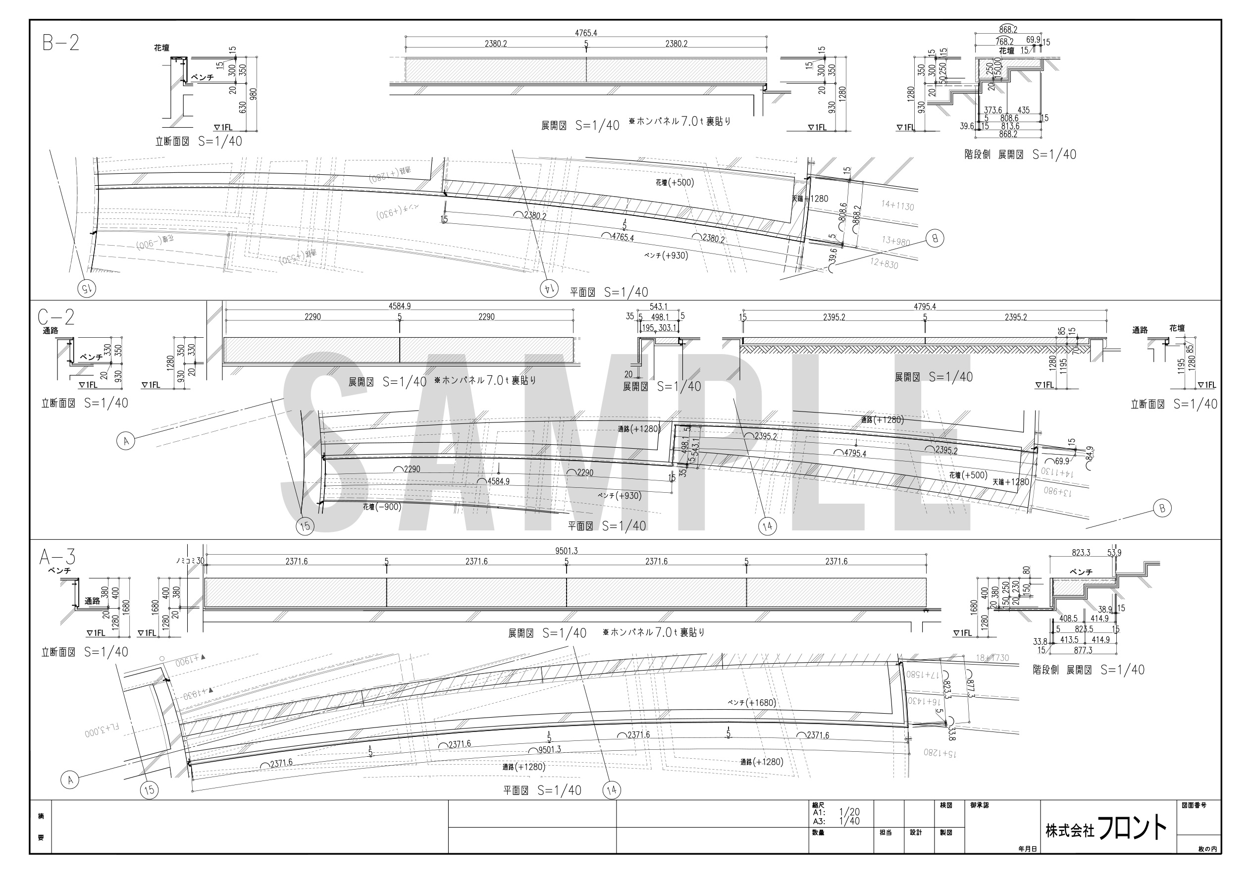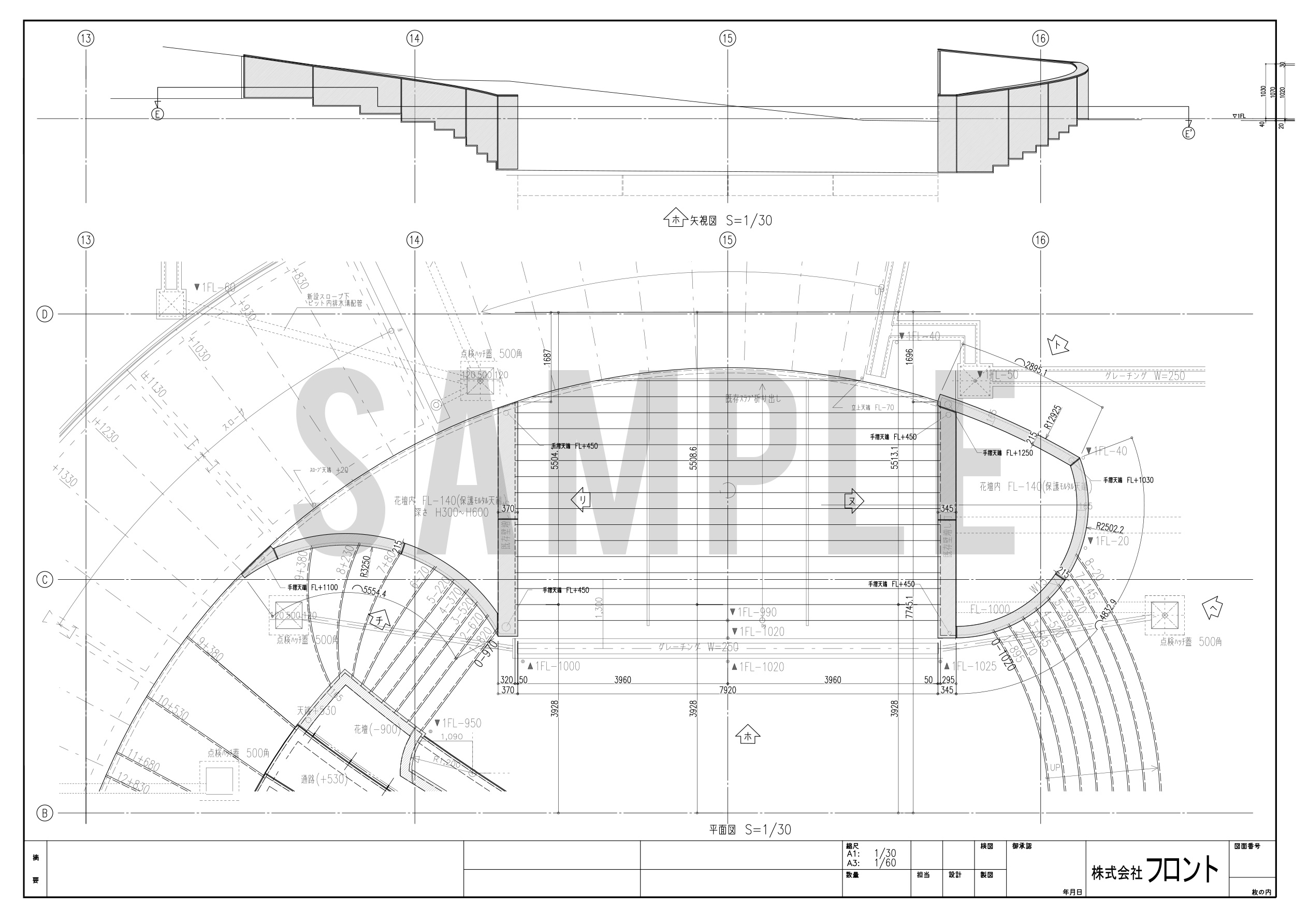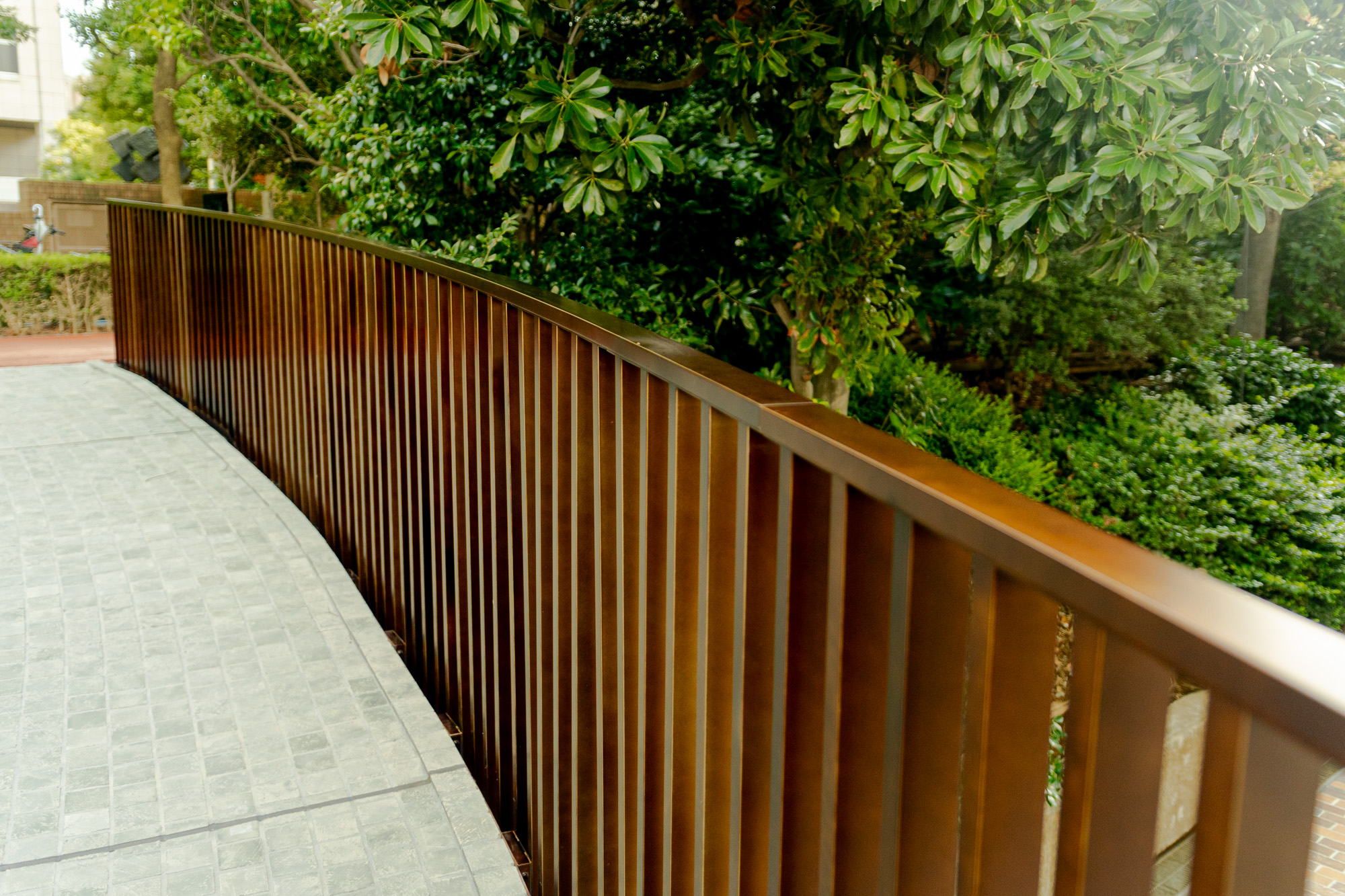 曲線をメインにした大胆で目を引くデザイン。設計、製作、取付どの作業も難易度が格段に高い工事でした。手摺・土留めパネル・笠木など多くのパーツにRがかかっており、スロープから植栽に繋がる手摺笠木は三次曲面になっています。設計はもちろんのこと、加工製作時には溶接を極力減らし、必要な部分では歪みを最小限に抑える工夫が必要です。一つ一つのパーツがきれいに出来上がっていて、且つそれらを組み合わせた納まりのアウトラインが揃っていることが見栄えの完成度、高級感に大きく影響します。全長が14mに及ぶ箇所では、最初が数㎜ずれるだけで末尾では数㎝ものずれが生じることもあるのです。特に曲面同士のコーナー部分の納まり形状(役物)には工事担当者も難儀しておりましたが、見事に作り上げました。出来上がっている状態を見ると、それがまるで自然な状態であるかのように思えてしまいますが、ほとんどが曲面で構成されたパネルと手摺を納めた職人の技術はかなり高度であると言えるでしょう。